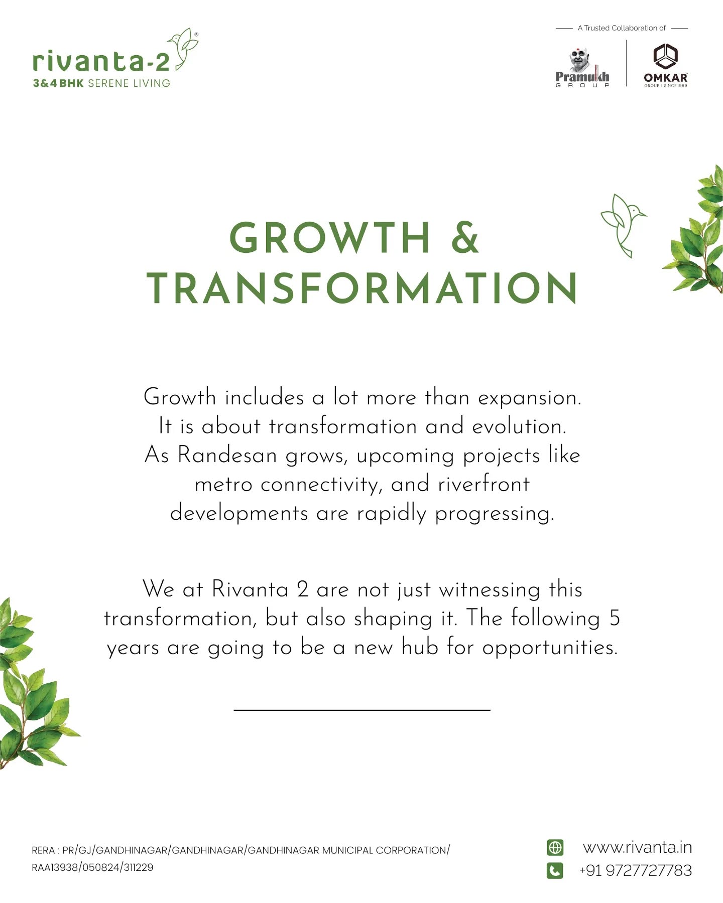 Randesan is evolving With Metro Station the upcoming Riverfront and Gandhinagar just minutes away Randesan is growing with a huge potential Be a part of this growth Luxurious 3 4 BHK apartments Book now Near Randesan Metro Station Gandhinagar 91 97 277 277 83